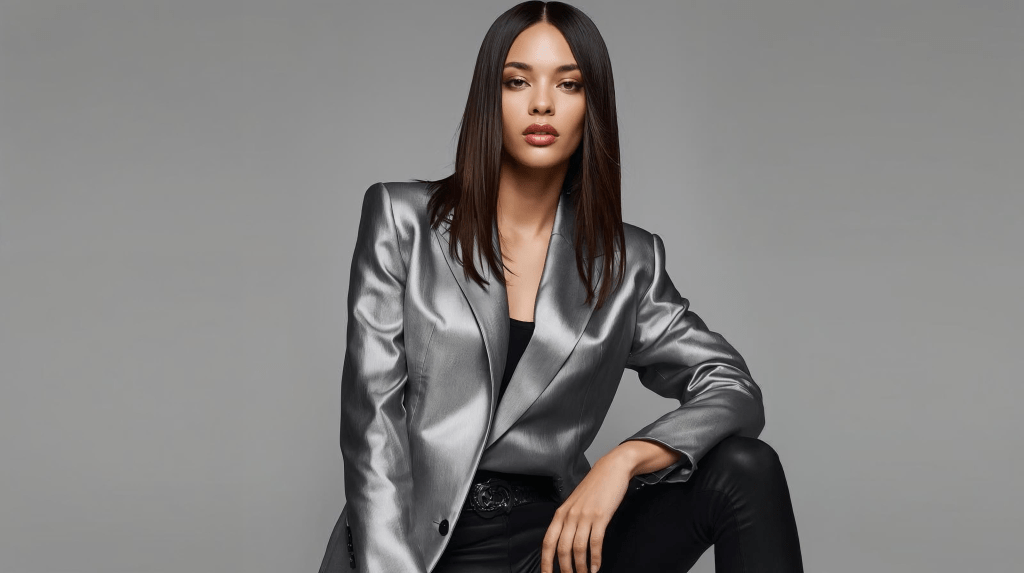 5. 🌟 Metallic Blazer with Sleek Hair