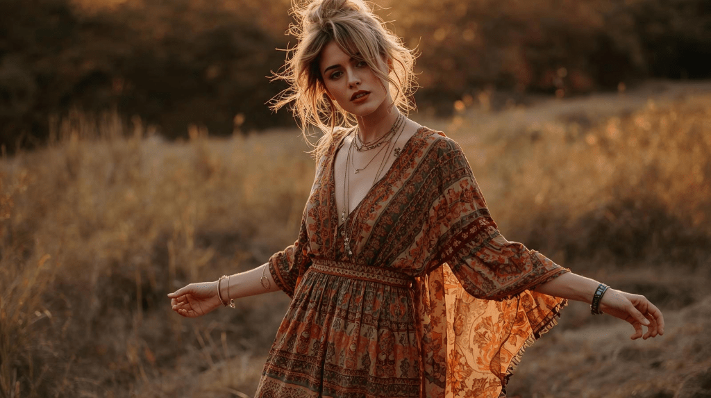 9. 🌼 Boho Maxi Dress + Messy Bun